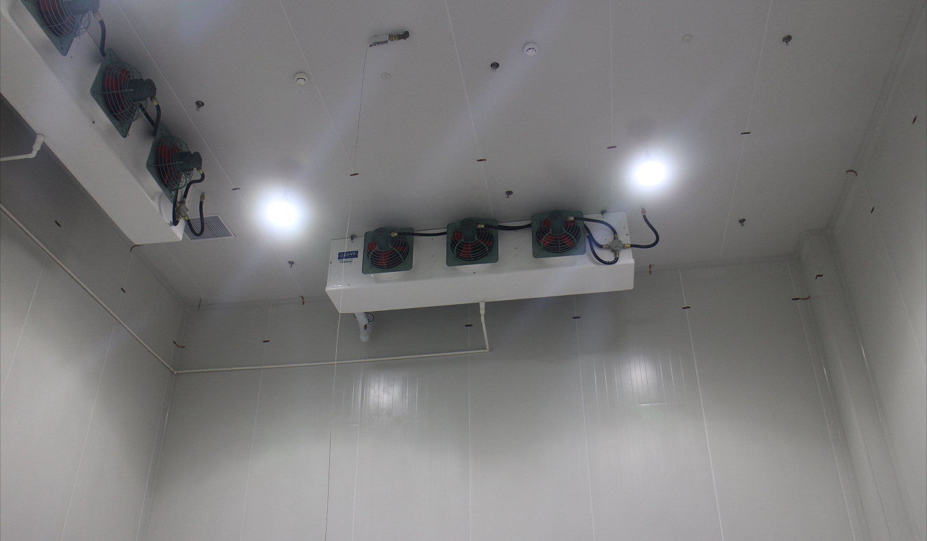 项目概况:汉高化学技术(上海)有限公司由我司负责设计建造1000立方防爆冷库,温度有0-5℃,15-20℃,0~5度冷库内使用二台比泽尔20匹压缩机组带动二台冷风机、一用一备。阴凉库配备4台大金5匹空调风管机组,三用一备。选用FM认证的B1级聚氨酯阻燃双面彩钢板,根据冷库温度要求,采用100mm厚双面0.6宝钢彩板,为了实时监测冷库内的温度,我司在冷库温度控制系统之外,配置了独立的温度监测设备,冷库所在的甲类仓库周围15米范围内都属于防爆危险区,通过了防爆冷库检测验收。
